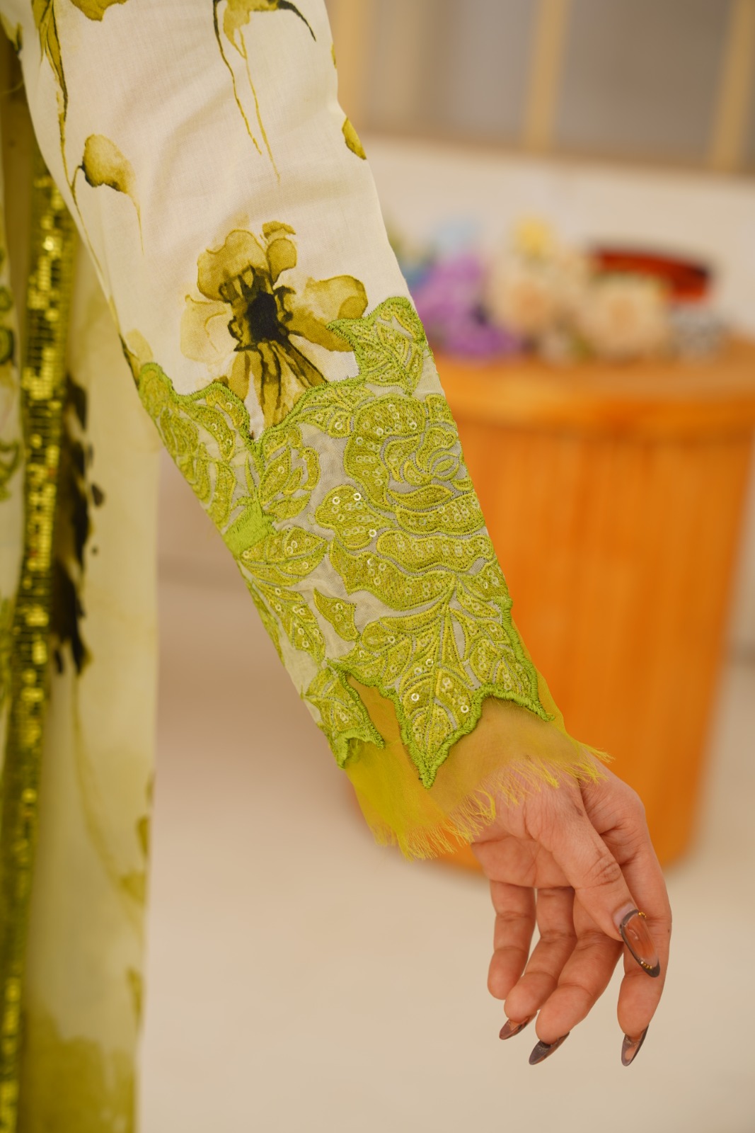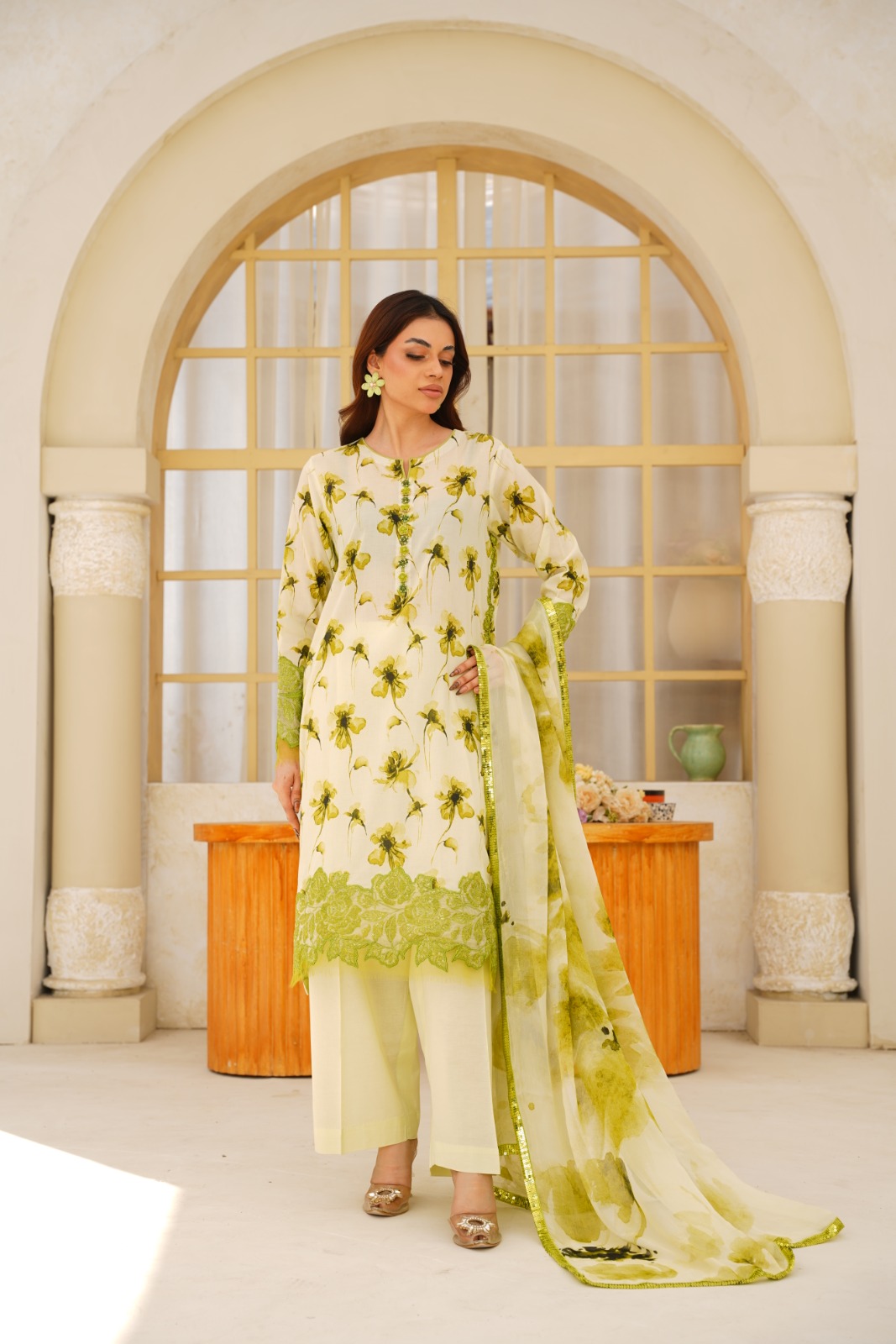 Premium three-piece printed lawn suit with embroidered detailing. Features a white digitally printed shirt with green floral motifs, light green trousers, and a matching green chiffon dupatta with glitter accents. Perfect for casual-elegant summer wear.