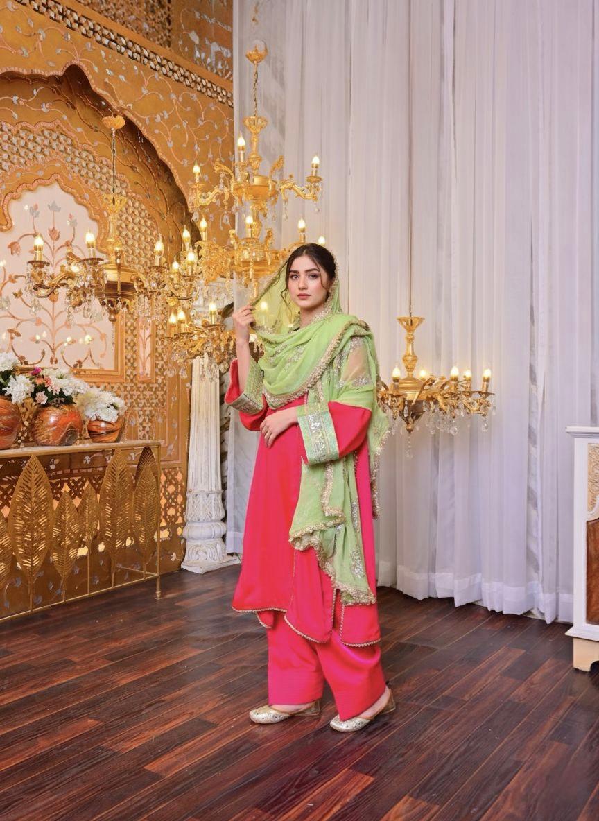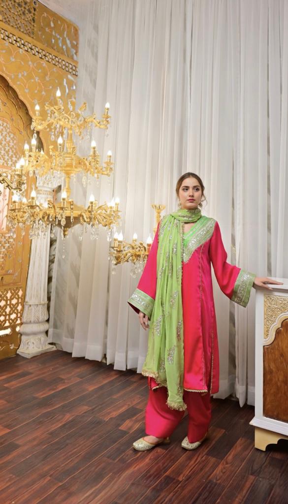 Suit Style: Pink kurta with straight-cut pink shalwar and a green dupatta.